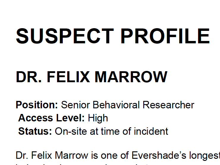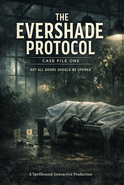 An interactive murder mystery case file. A prominent researcher is found dead inside the greenhouse of Evershade Behavioral Institute. What appears at first to be a medical incident quickly reveals signs of deliberate control. Explore the case through procedural records, environmental analysis, and initial suspect interviews. Examine inconsistencies, track behavior, and decide for yourself what truly happened. This is a standalone case file designed to be explored at your own pace. There is no single official solution.